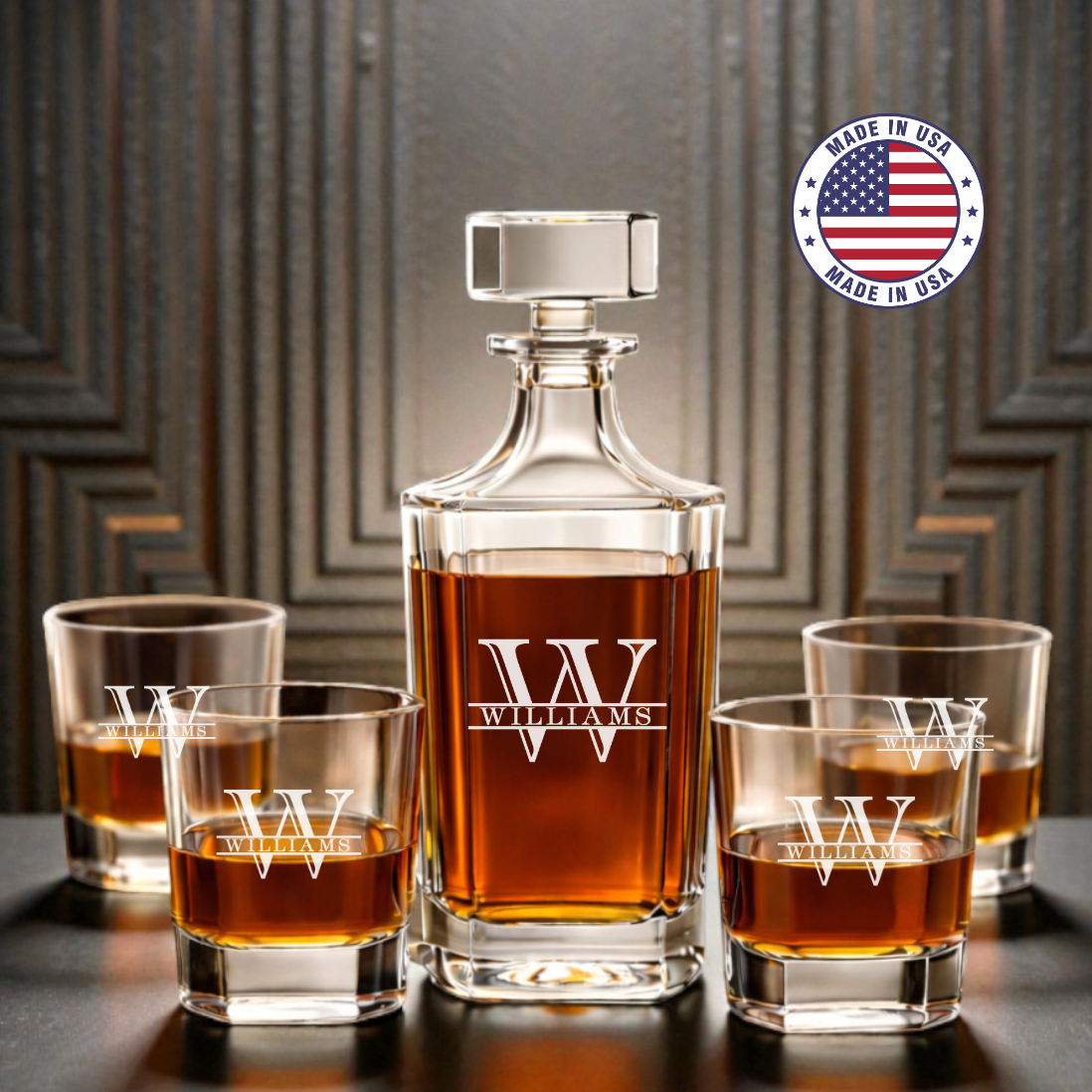 Proudly made in the USA, this personalized whiskey decanter set features a classic square decanter and four matching rocks glasses with a timeless, upscale look for any home bar, office, or lounge.